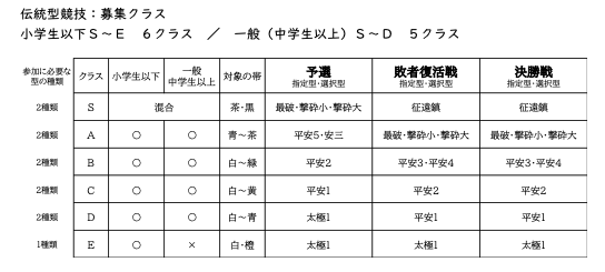- クラスごとに決められた型を演武します。指定型が2つ以上ある場合はその中から自由に選択できます。