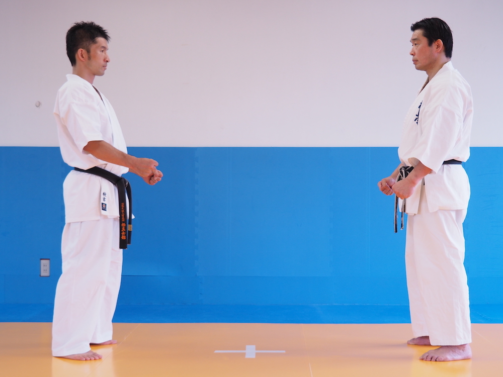 仕掛け手が後拳直突きで仕掛ける。それに対し、応じ手は左合わせ突きで応じる。その2