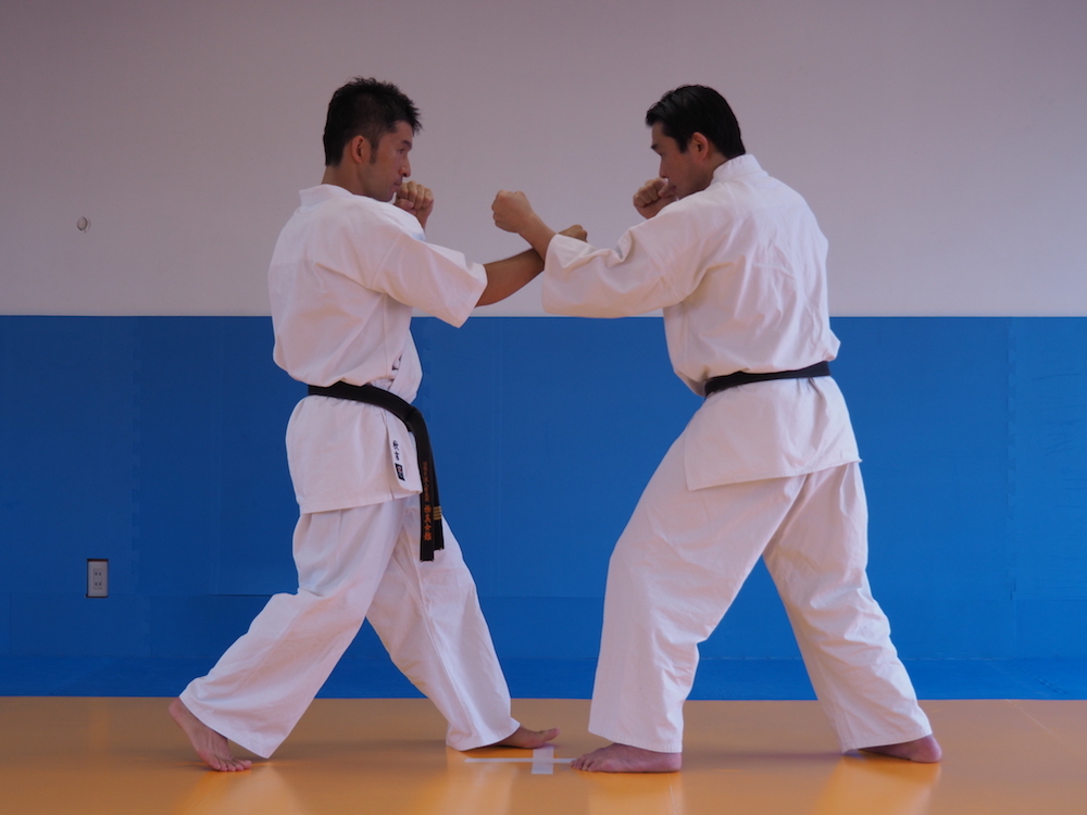 仕掛け手が後拳直突きで仕掛ける。それに対し、応じ手は左合わせ突きで応じる。その1