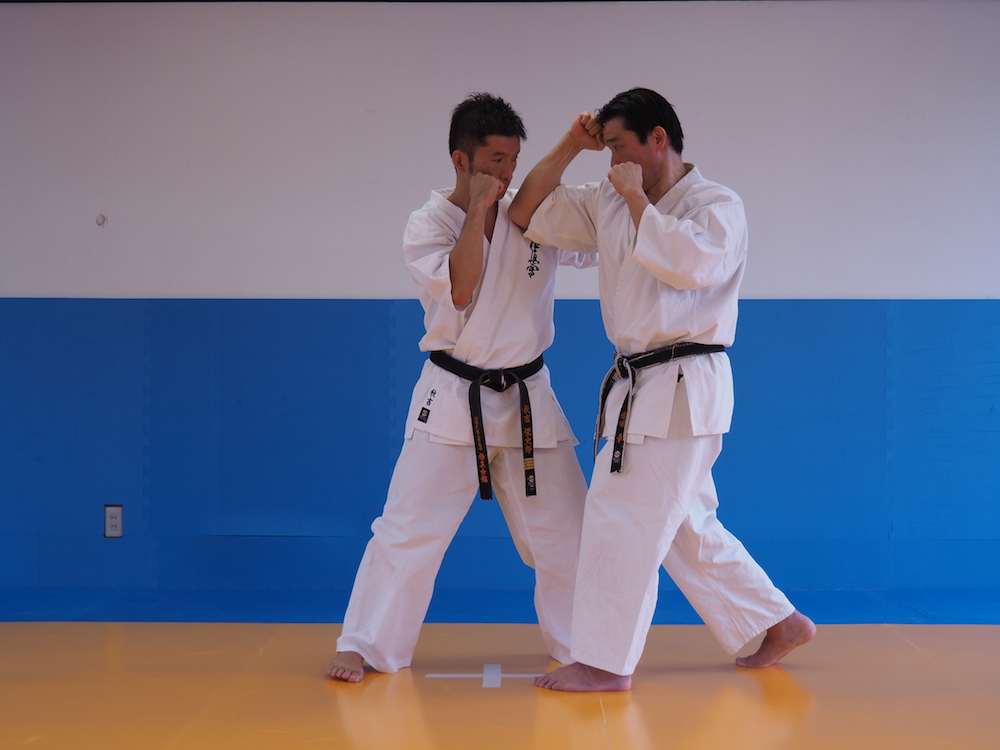 仕掛け手が前拳鍵突きで仕掛ける。それに対し、応じ手は右合わせ肘打ち(肘上げ打ち)で応じる。その1