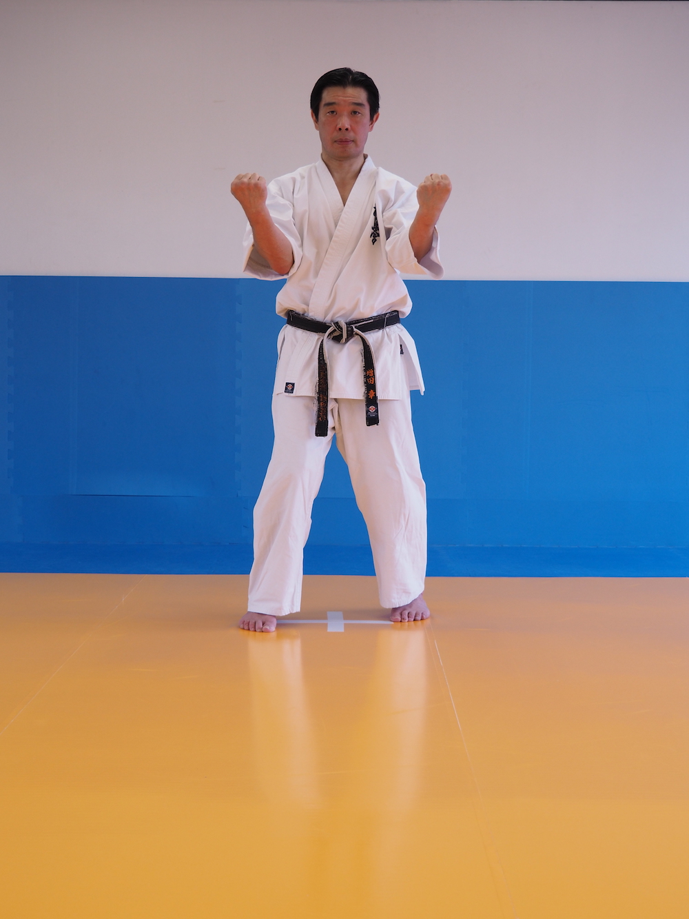 正中線上、下段で重ねた腕は、肘を中心に上に曲げる。曲げた腕の肘は90度、拳の高さは肩の高さ、腕の幅は肩幅ぐらいとする。この構えを「三戦構え」と呼ぶ(IBMA極真会館空手道)。