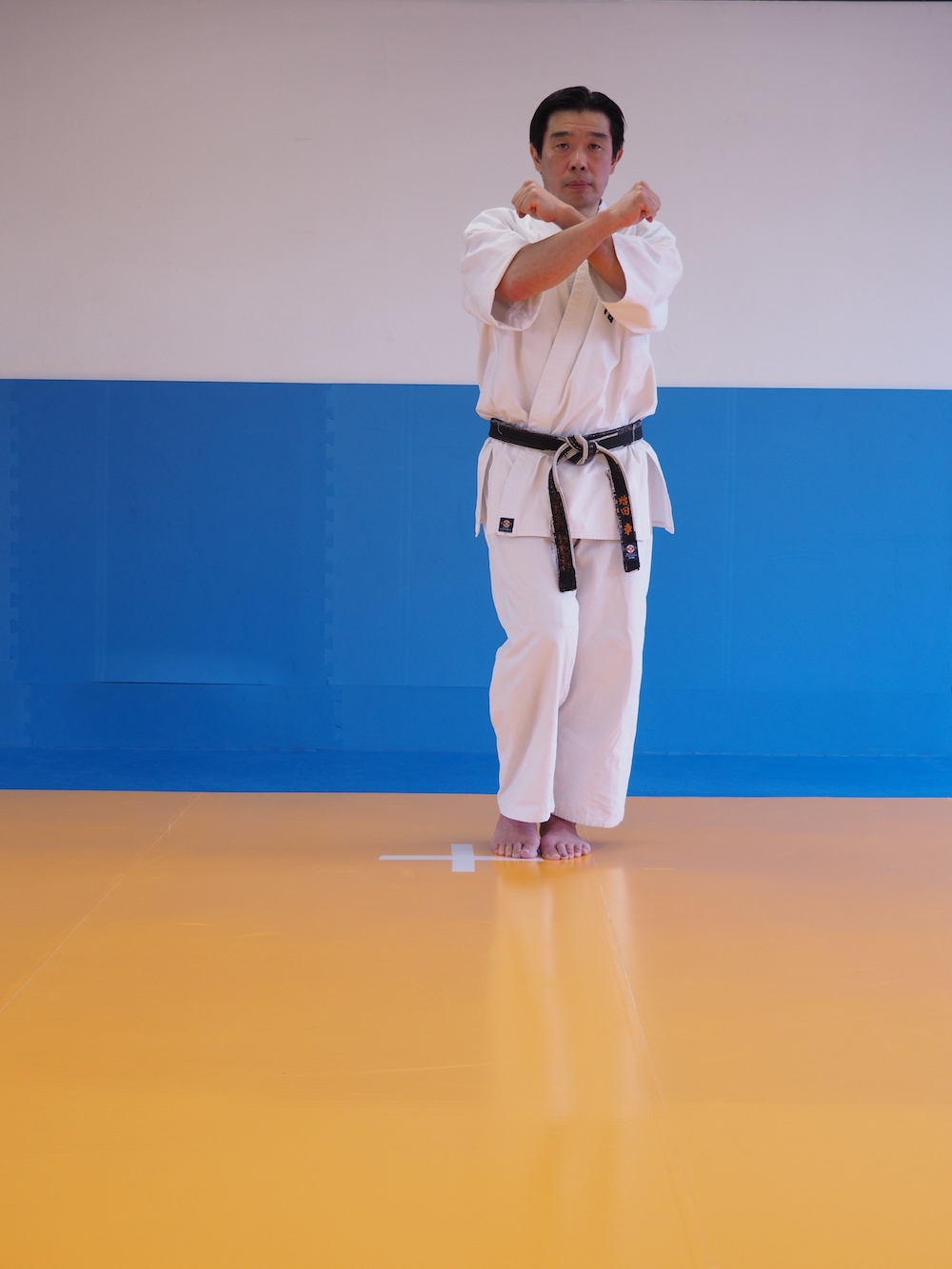 「直れ」で右足を左足に寄せるようにしながら胸の前で腕を十字に重ねて、元の位置(不動立ちの右足の位置/左右の足を同一線上に並ぶように))の位置に戻す。